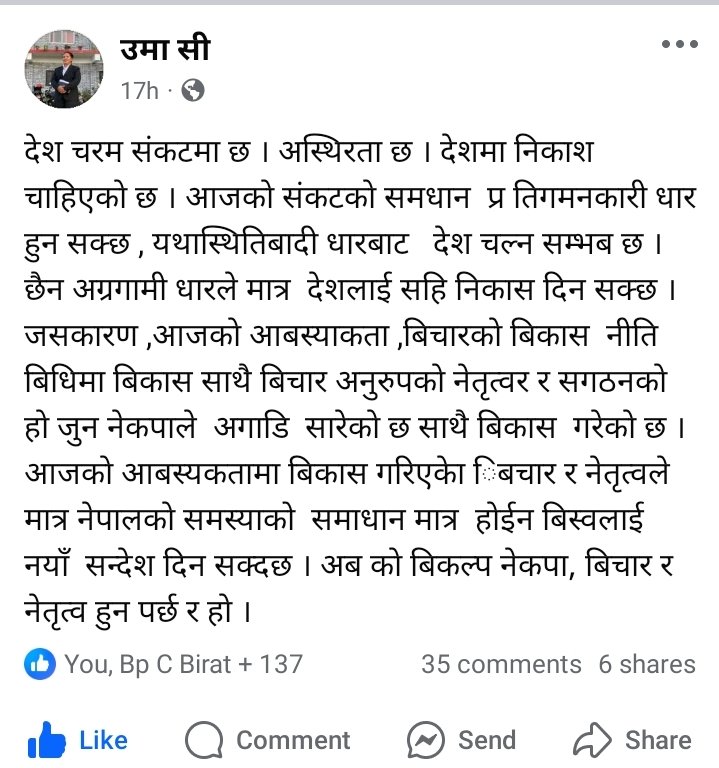 उनले विश्वलाई नयाँ सन्देश दिन नेकपाको विचार र नेतृत्व नै विकल्प भएको बताएकी छन् ।