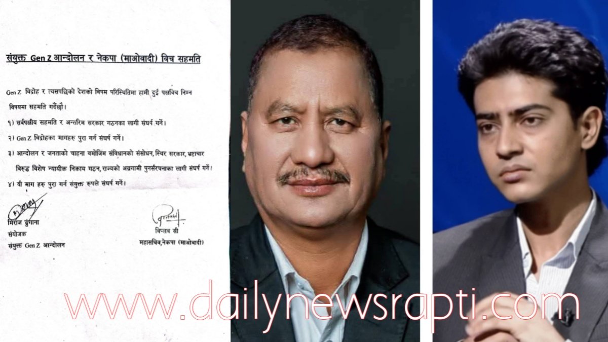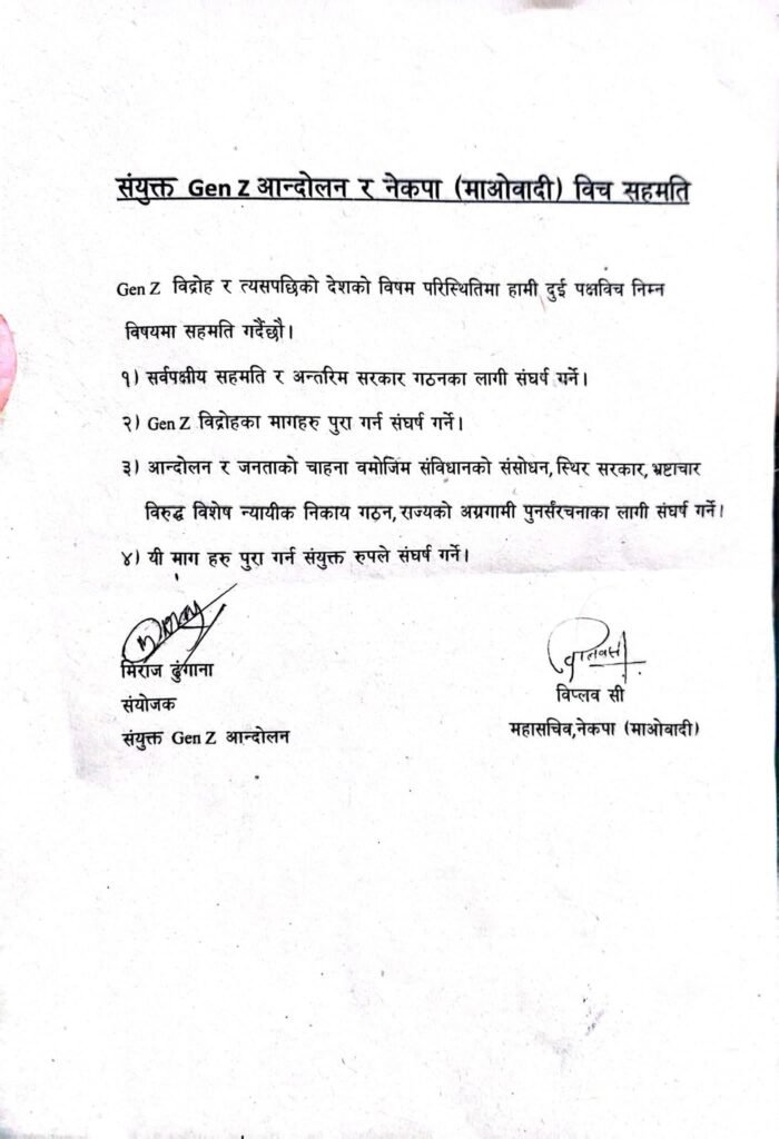 सहमति पत्रमा नेकपा (माओवादी)का महासचिव विप्लव सी र संयुक्त जेन-जी आन्दोलनका संयोजक मिराज ढुंगानाले हस्ताक्षर गरेका छन् ।