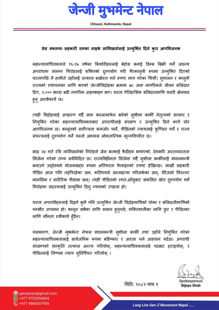 जेन्जी मुभमेन्टले अपराधीलाई दिइने कुनै पनि उन्मुक्तिलाई जेन्जी विद्रोहमाथिको धोका र बलिदानीमाथिको गम्भीर अपमानको रूपमा व्याख्या गरेको छ। “कानून सबैका लागि समान हुनुपर्छ, शक्तिशालीका लागि छुट र पीडितका लागि मौनता स्वीकार्य छैन,” वक्तव्यमा भनिएको छ।