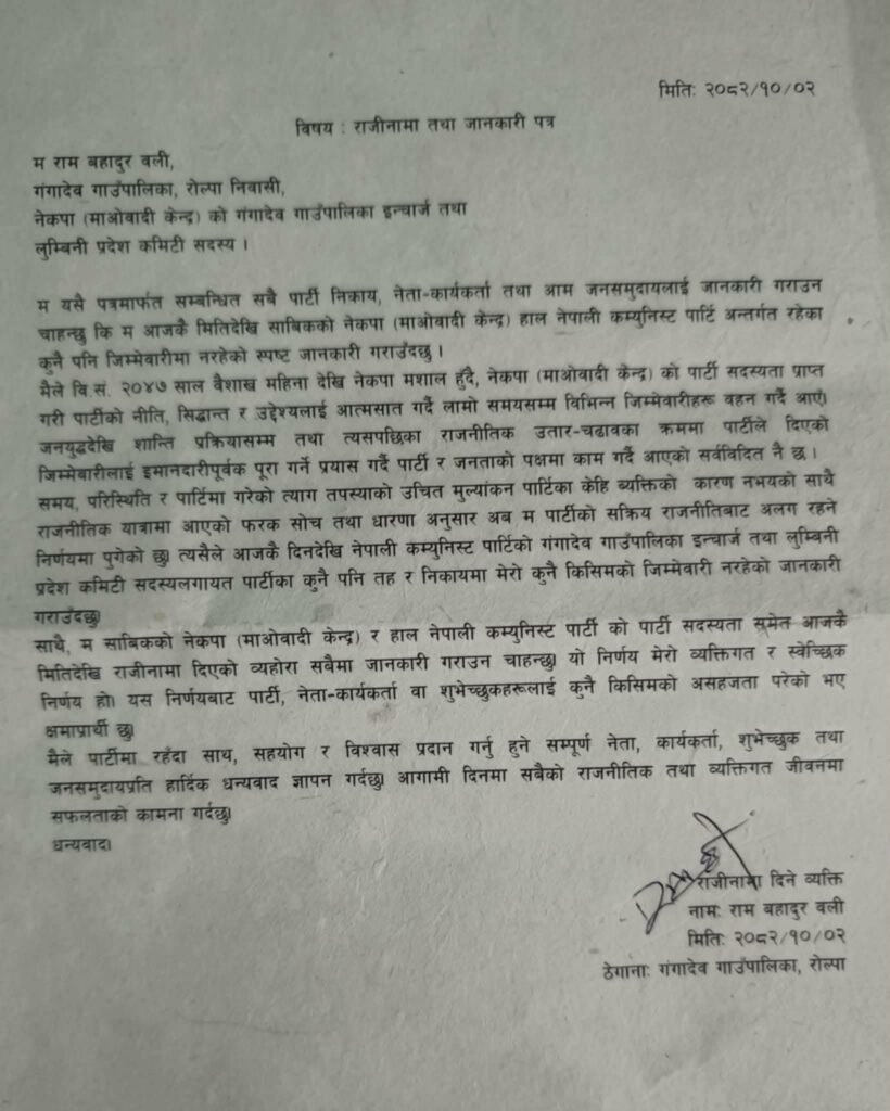 मैले वि.सं. २०४७ साल वैशाख महिना देखि नेकपा मशाल हुँदै, नेकपा (माओवादी केन्द्र) को पार्टी सदस्यता प्राप्त गरी पार्टीको नीति, सिद्धान्त र उद्देश्यलाई आत्मसात गर्दै लामो समयसम्म विभिन्न जिम्मेवारीहरू वहन गर्दै आएँ। जनयुद्धदेखि शान्ति प्रक्रियासम्म तथा त्यसपछिका राजनीतिक उतार-चढावका क्रममा पार्टीले दिएको जिम्मेबारीलाई इमानदारीपूर्वक पूरा गर्ने प्रयास गर्दै पार्टी र जनताको पक्षमा काम गर्दै आएको सर्वविदित नै छ । समय, परिस्थिति र पार्टिमा गरेको त्याग तपस्याको उचित मुल्यांकन पार्टिका केहि व्यक्तिको कारण नभयको साथै राजनीतिक यात्रामा आएको फरक सोच तथा धारणा अनुसार अब म पार्टीको सक्रिय राजनीतिबाट अलग रहने निर्णयमा पुगेको छ। त्यसैले आजकै दिनदेखि नेपाली कम्युनिस्ट पार्टिको गंगादेव गाउँपालिका इन्चार्ज तथा लुम्बिनी प्रदेश कमिटी सदस्यलगायत पार्टीका कुनै पनि तह र निकायमा मेरो कुनै किसिमको जिम्मेवारी नरहेको जानकारी गराउँदछु