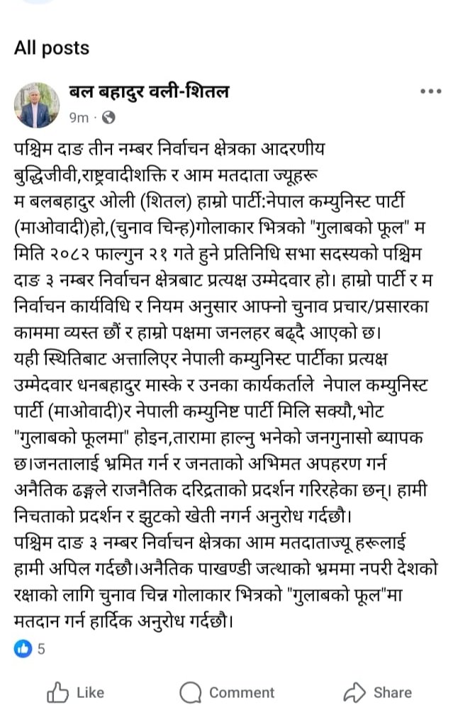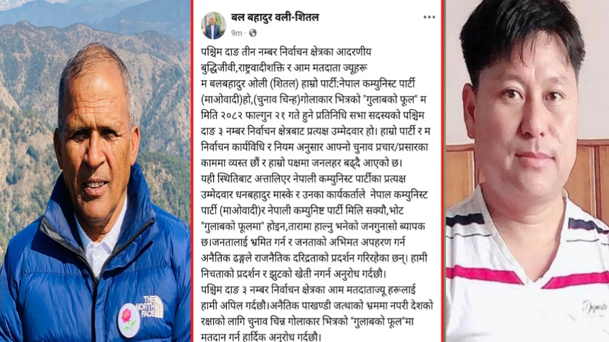 शितलले विज्ञप्ति जारी गर्दै नेपाली कम्युनिष्ट पार्टीका उम्मेदवार धनबहादुर मास्के र उनका कार्यकर्ताले “नेपाल कम्युनिस्ट पार्टी (माओवादी) र नेपाली कम्युनिष्ट पार्टी मिलिसकेको, त्यसैले भोट गुलाबको फूलमा होइन, तारामा हाल्नुपर्छ” भन्ने भ्रामक हल्ला फैलाएको जनगुनासो व्यापक रूपमा प्राप्त भएको उल्लेख गर्नुभयो।