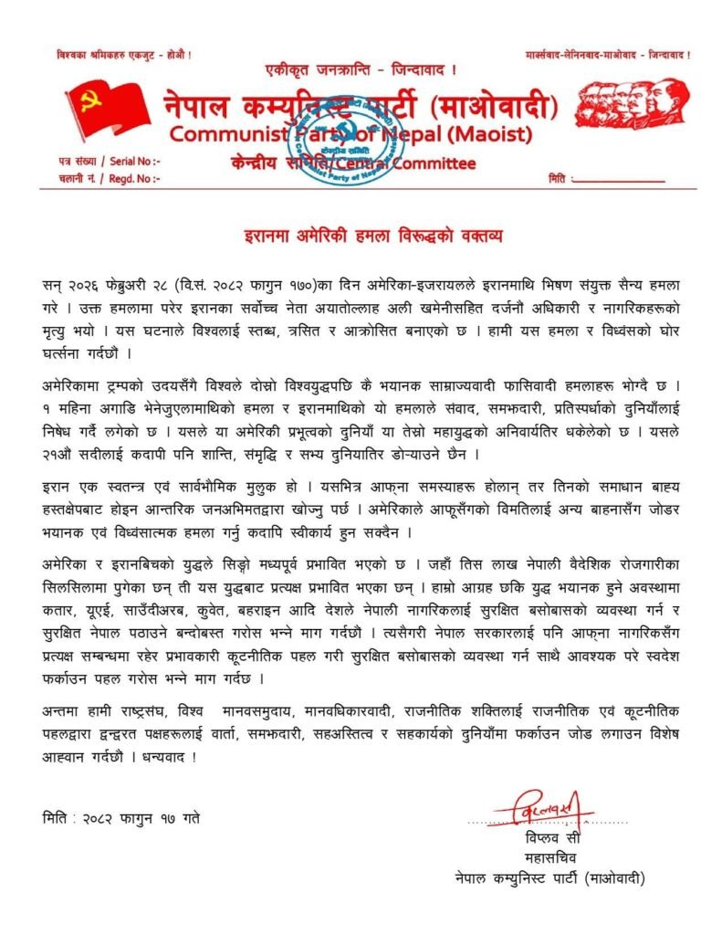 काठमाडौं, फागुन १७ — नेपाल कम्युनिस्ट पार्टी (माओवादी) ले इरानमाथि अमेरिका–इजरायलद्वारा गरिएको संयुक्त सैन्य हमलाको कडा शब्दमा विरोध गरेको छ।