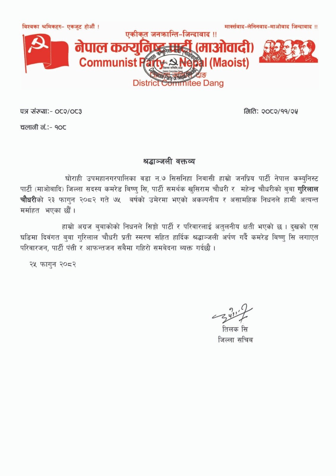 पार्टीको नेपाल कम्युनिस्ट पार्टी (माओवादी) जिल्ला समिति दाङले सोमबार श्रद्धाञ्जली वक्तव्य जारी गर्दै घोराही उपमहानगरपालिका–७ सिसनिहा निवासी गुरिलाल चौधरीको ७५ वर्षको उमेरमा फागुन २२ गते असामयिक निधन भएको जनाएको छ।