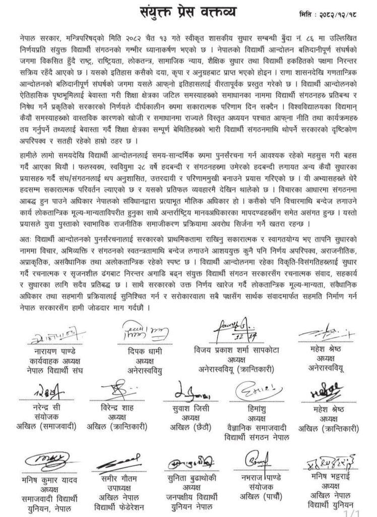 वक्तव्यमा शिक्षा क्षेत्रमा देखिएका समस्यालाई बहाना बनाएर विद्यार्थी संगठनहरूलाई प्रतिबन्ध लगाउने सोच दीर्घकालीन रूपमा हानिकारक हुने उल्लेख गरिएको छ। “समस्या समाधानका नाममा संगठनमाथि अंकुश लगाउनु उचित होइन,” वक्तव्यमा भनिएको छ, “बरु वास्तविक कारण पहिचान गरी गहिरो अध्ययनपछि मात्र नीतिगत निर्णय लिनु आवश्यक छ।”