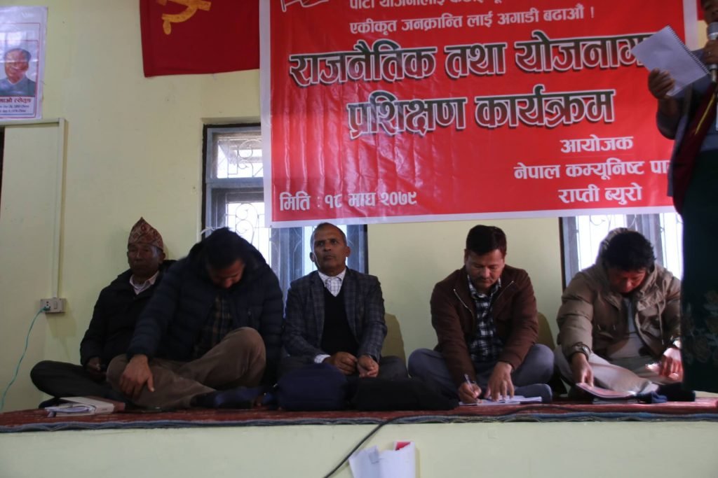 पार्टीको राप्ती ब्युरोको राजनैतिक तथा योजनागत प्रशिक्षण कार्यक्रममा नेकपाका स्थायी कमिटी सदस्य भरत सी (रणविर) लगाएतका नेताहरुले प्रशिक्षण दिएका थिए । प्रशिक्षण कार्यक्रममा राप्तीभरिका करिव २०० बढी जिल्ला कमिटी सदस्यहरुको उपस्थिति रहेको थियो ।